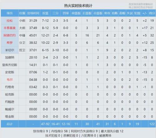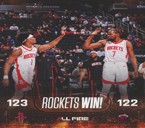北京時間3月22日,NBA常規賽:火箭123-122絕殺熱火。阿德巴約21投12中,三分4中2,罰球8中6,狂砍32分21籃板4助攻2搶斷。阿門-湯普森17投10中,三分1中1,罰球3中3,砍下24分18籃板4助攻,最后時刻壓哨補籃絕殺。