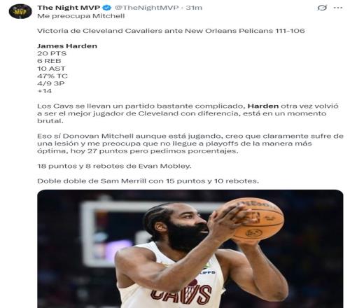 美媒TNM寫道:騎士打了一場很艱難的比賽,哈登再次成為克利夫蘭最出色的球員,米切爾雖然登場了但我覺得他的傷還沒有痊愈,我擔心他不能以100%的狀態進入季后賽。
