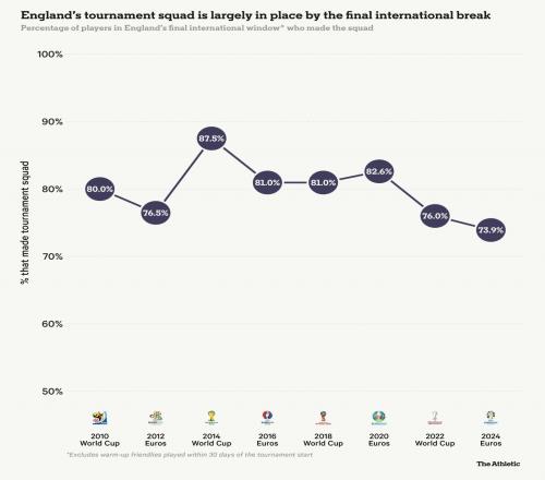 英格蘭最后一個國際比賽窗口中入選大賽陣容的球員比例↓