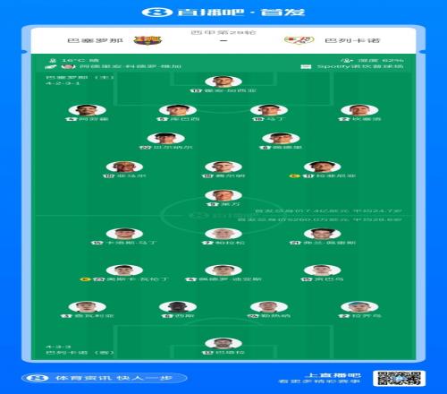 巴薩首發(fā):13-霍安·加西亞、2-坎塞洛、4-阿勞霍、5-庫巴西、18-赫拉德·馬丁、8-佩德里、22-貝爾納爾、16-費爾明、10-亞馬爾、11-拉菲尼亞、9-萊萬