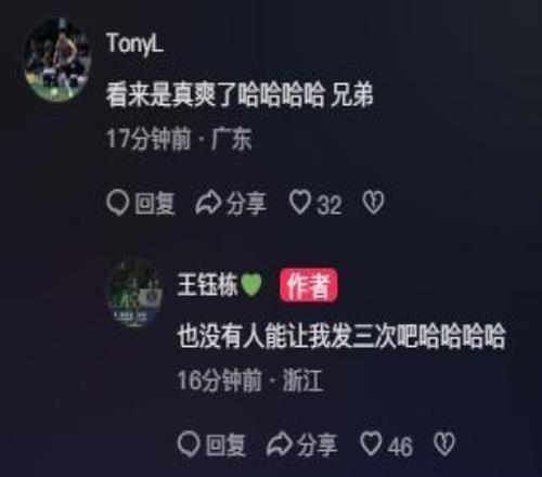 王鈺棟回復道:“也沒有人能讓我發(fā)三次吧?哈哈哈哈。”