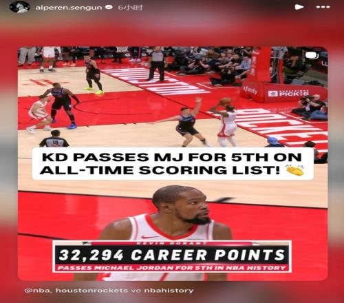在本場(chǎng)比賽中,杜蘭特生涯總得分32294分,超越喬丹,上升至歷史第五。