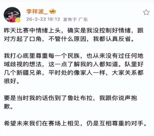 而在今天李祥波進(jìn)行了道歉,他表示:打心底里尊重每一個(gè)民族,也從來沒有過任何地域歧視的想法。要是當(dāng)時(shí)我的話傷到了魯吐布拉,我跟你說聲抱歉。這樣的話語非常明確了,這只是當(dāng)時(shí)情緒過頭了,所以他會出現(xiàn)那樣的話語。不過這樣的言論肯定是大家不認(rèn)可的,確實(shí)情緒上頭了,但也不能將所有歸結(jié)于情緒的問題。不過主動(dòng)道歉是好事,后續(xù)還是要盡可能避免。