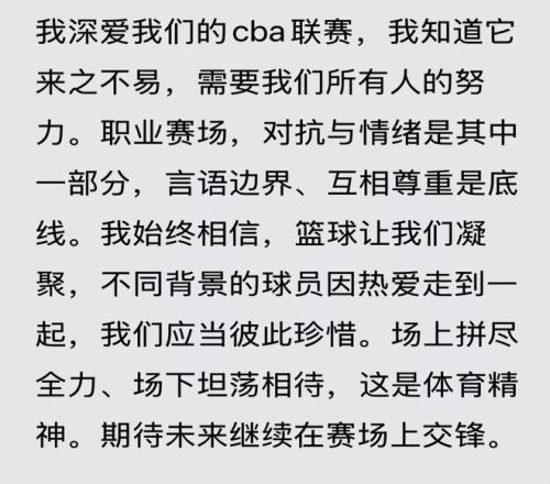 在李祥波發(fā)表自己的道歉之后,魯吐布拉還進(jìn)行了回應(yīng),他表示:對抗與情緒是其中一部分,言語邊界,互相尊重是底線。場上拼盡全力,場下坦蕩相待,這是體育精神。期待未來繼續(xù)在賽場上交鋒。所以他認(rèn)為不能因?yàn)榍榫w失控出現(xiàn)一些失格的話語。反正昨天的比賽魯吐布拉非常憤怒,當(dāng)然他今天的格局也打開了,明明受了委屈,還能為了聯(lián)賽和體育精神站出來定調(diào),這是讓人欽佩的。
