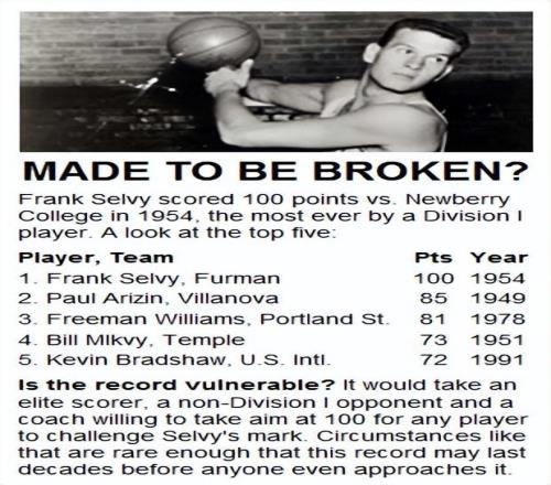 1954年2月13日,那是南卡羅來納州格林維爾市球迷永遠(yuǎn)難忘的一天。在對陣紐伯里學(xué)院的比賽中,塞爾維手感熱得發(fā)燙。隊(duì)友們見狀,干脆戰(zhàn)術(shù)也不打了,全場瘋狂給他喂球。最終,他全場66投41中,罰球22罰18中,在終場哨響前穩(wěn)穩(wěn)命中,剛好湊齊100分大關(guān)!