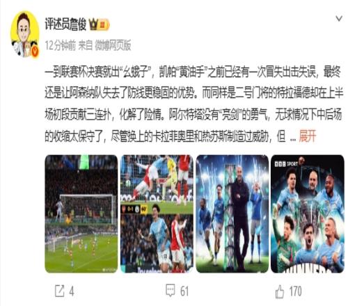 體育播報(bào)03月23日宣 聯(lián)賽杯決賽,曼城擊敗阿森納奪冠。賽后,評(píng)述員詹俊發(fā)文。