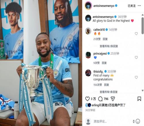 賽后塞梅尼奧也在社媒曬出與冠軍獎杯合影,這也是他在曼城奪得的首個(gè)冠軍,他配文寫道:“所有榮耀歸于上帝!”