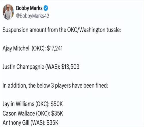 北京時間3月23日,NBA官方發布公告宣布,由于在周日兩隊的沖突事件中涉事,奇才隊前鋒賈斯汀-尚帕涅和雷霆隊后衛阿賈伊-米切爾各被禁賽一場。聯盟聲明稱,尚帕涅和米切爾因在場上發生沖突、激化斗毆行為,且沖突蔓延至觀眾席,被處以無薪禁賽。除兩人遭禁賽外,雷霆內線球員杰林-威廉姆斯被罰款5萬美元,雷霆后衛卡森-華萊士和奇才前鋒安東尼-吉爾各被罰款3.5萬美元。