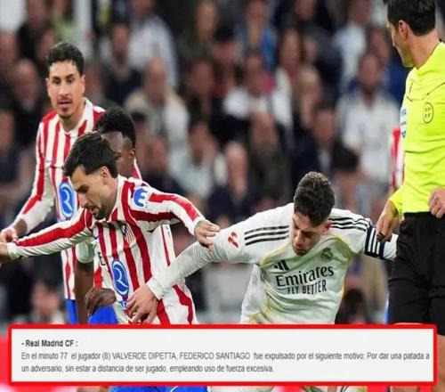 據悉,主裁判何塞-穆努埃拉的裁判報告中寫明:第77分鐘,8號球員費德里科-圣地亞哥-巴爾韋德-迪佩塔被紅牌罰下,被罰原因是在距離可觸球范圍之外踢擊對手,且使用了過度力量。