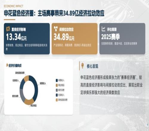 來自申花官方的數據顯示,主場賽事的直接經濟影響達到13.34億元,這主要包括球票銷售、球隊周邊商品和餐飲住宿等賽事直接的相關消費。相較于直接經濟影響13.34億元,申花主場賽事高達34.89億元的經濟拉動效應或許更加讓人感到驚喜。每逢比賽日,賽事引入大量人流,球迷會在賽前1到2小時抵達賽場,賽后停留時長達到3.5小時+,形成了持續6小時以上的消費窗口期,這極大激活周邊的商業業態。