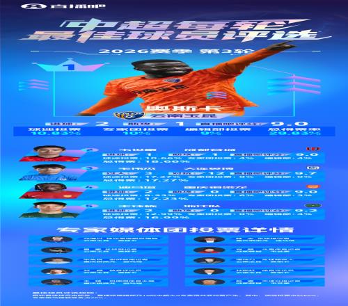 附:每輪最佳球員將由吧友、體育播報編輯部及10位中超大V專家團共同投票產生。其中,球迷投票占比60%,專家團與編輯部各占20%,讓球迷聲音與媒體視角共同決定最終歸屬。