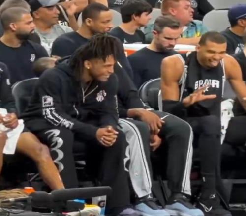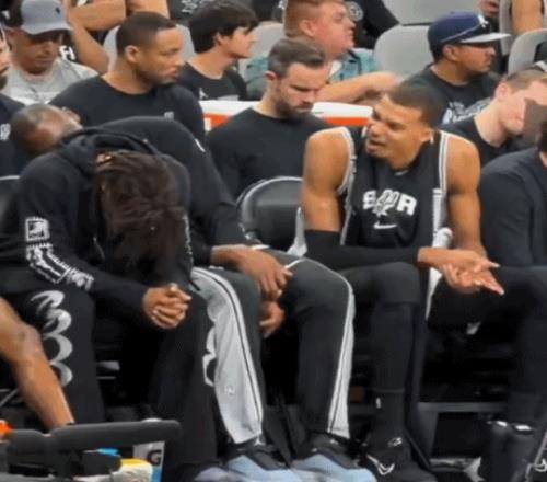 嘛呢班子文班昨日替補席和卡斯爾玩鬧搞怪模仿小狗吐舌