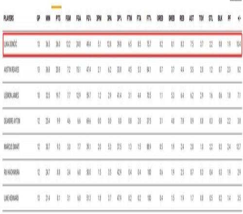 全隊場均得分第二的里夫斯只有20.8分,詹姆斯場均19.7分,全隊只有三人上雙,東契奇一人扛的產量太恐怖了。