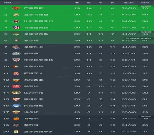 北京時間3月23日,隨著皇馬3-2力克馬競、畢爾巴鄂競技2-1皇家貝蒂斯、阿拉維斯-3塞爾塔、巴薩1-0小勝巴列卡諾的比賽結束,西甲第29輪結束了全部比賽,最新排名如下!