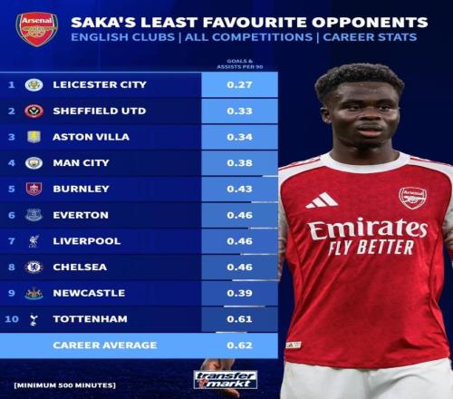 北京時間3月23日,在阿森納聯賽杯決賽0-2不敵曼城之后,德轉統計出了薩卡槍手生涯至今各項賽事面對英格蘭俱樂部平均每90分鐘直接參與進球數最低的10個對手,其中他14次對陣曼城只貢獻過2球2助攻,平均每90分鐘只能制造0.38球。