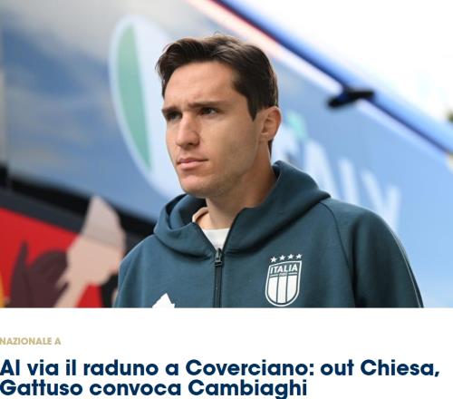 意大利國家隊今日在科維恰諾開始集訓,備戰世界杯附加賽。今天下午將進行首次訓練。在抵達訓練基地后,費德里科·基耶薩因身體狀況不佳無法出戰接下來的兩場比賽,經與俱樂部協商,他已離開國家隊集訓營。主教練加圖索決定補招博洛尼亞前鋒尼科洛·坎比亞吉。