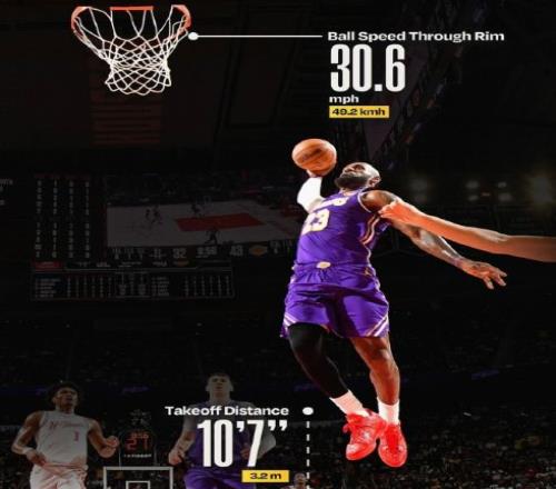 最后說一個冷知識,在此前19日對陣火箭的比賽中,詹姆斯有一個遠距離扣籃,距離籃筐10英尺7英寸,大概為3.2米,是本賽季第三遠距離扣籃,可見詹姆斯身體天賦逆天到何等地步。