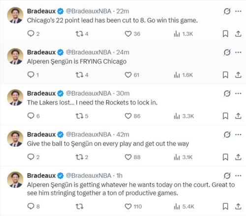 第三節(jié)申京更是單節(jié)6中6拿到12分6助攻5籃板,休媒:申京此役在球場上所向披靡,他想要什么就有什么??吹剿舆B打出多場高效的比賽真是太好了?;鸺?duì)在一度落后22分的情況下他一人扛著球隊(duì),申京正在烹飪公牛!