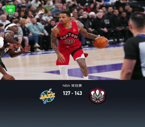 第四節(jié)爵士森薩博拿下10分,猛龍賈米森-巴特爾拿下6分,最終爵士127-143不敵猛龍