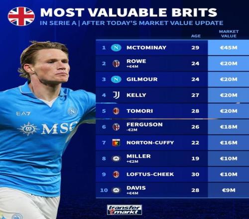 北京時間3月24日,在更新了意甲球員的身價之后,德轉統計出了此次更新后意甲身價排名前10的英國球員,麥克托米奈以4500萬歐元排名第1,勞埃德-凱利、托莫里、洛夫圖斯-奇克上榜。
