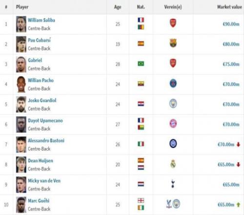 最新全球中后衛(wèi)身價(jià)排名(單位:歐元)