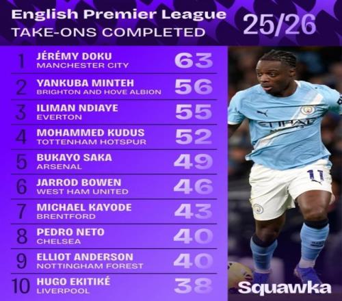 3月24報(bào)道 數(shù)據(jù)機(jī)構(gòu)Squawka統(tǒng)計(jì)出了本賽季英超球員過人數(shù)情況,曼城邊鋒多庫以63次居首。