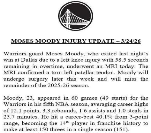 勇士是本賽季慘遭傷病潮困擾最嚴重的隊伍之一,且多是主力球員重傷,穆迪之前還有巴特勒右膝前十字韌帶撕裂、庫里由于右膝髕股關節疼痛綜合征(跑步膝)已連續休戰22場比賽,以及霍福德因為比目魚肌拉傷連續缺席6場歸期待定等等。