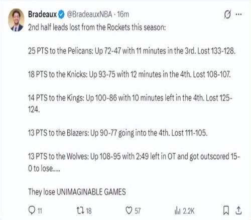 他繼續(xù)寫道:火箭隊(duì)本賽季在下半場領(lǐng)先的比賽已經(jīng)輸?shù)舻谖鍒觯?/p>