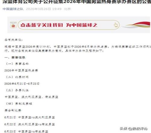 北京時間3月26日,根據中國籃協官方社媒公示,中國男籃2026年競訓計劃,中國男籃擬于2026年6月國內舉辦熱身賽。