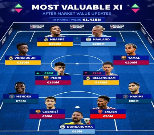體育播報03月29日宣 德轉盤點了最新足壇最貴陣容,總身價達14.1億歐,姆巴佩、哈蘭德、亞馬爾均2億歐。