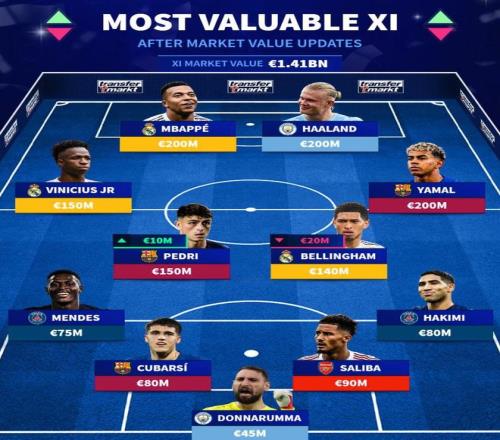 北京時間3月29日,在更新了歐洲五大聯賽球員的身價之后,德轉列出了目前世界足壇最貴的11人陣容,姆巴佩、哈蘭德以及亞馬爾同以2億歐元領銜。