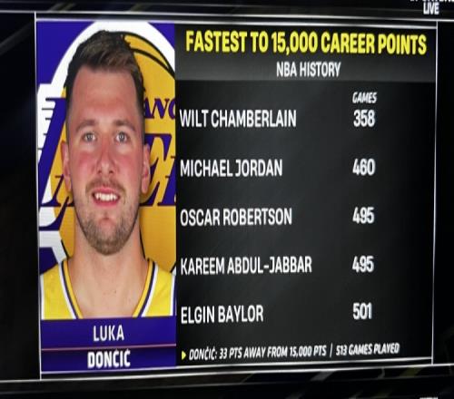 現場給出統計,東契奇距離15000分只差33分,今天是他生涯的第513場比賽。