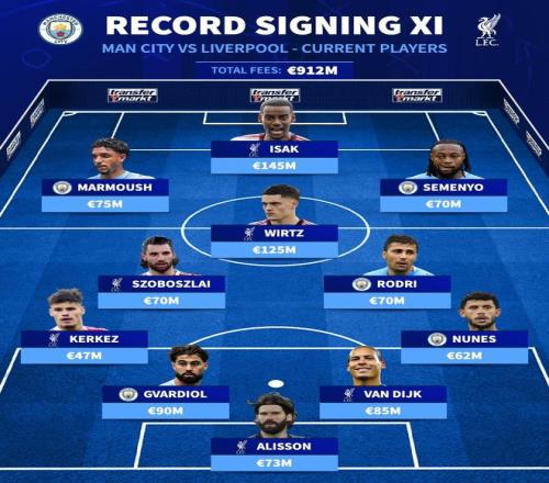 北京時(shí)間明天19:45,曼城和利物浦將在足總杯1/4決賽交手。德國轉(zhuǎn)會(huì)市場(chǎng)網(wǎng)站列出了兩隊(duì)現(xiàn)役最貴轉(zhuǎn)會(huì)費(fèi)的陣容,其中利物浦六人、曼城五人基本平分秋色,利物浦在去年夏窗重金簽下的伊薩克、維爾茨位列前二,這套陣容的總轉(zhuǎn)會(huì)費(fèi)則達(dá)到了驚人的9.12億歐元。