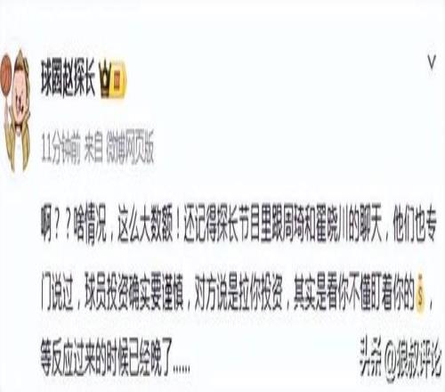 啥情況,這么大數額!還記得探長節目里跟周琦和翟曉川的聊天,他們也專門說過,球員投資確實要謹慎,對方說是拉你投資,其實是看你不懂盯著你的錢,等反應過來的時候已經晚了。