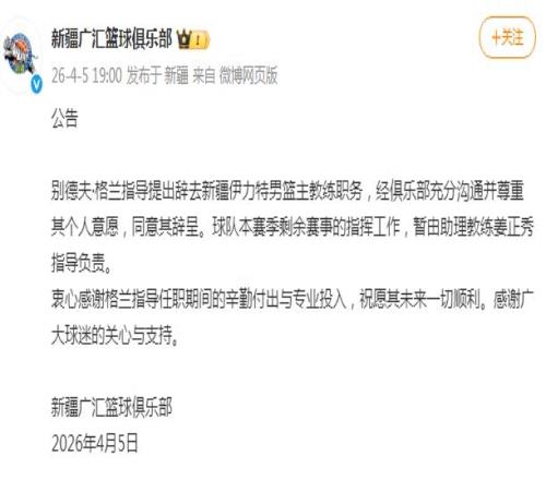 北京時間4月5日,新疆男籃官方發布公告,正式宣布主教練格蘭提出辭去新疆男籃主教練職務,經俱樂部充分溝通并尊重其個人意愿,同意其辭呈。至于剩余的賽事,將暫由助理教練姜正秀指導負責。