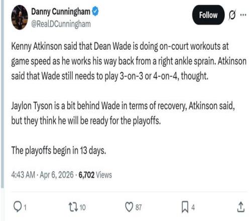 遭遇左大腳趾骨挫傷的泰森,傷病恢復進度比韋德慢一些,但阿特金森表示球隊預計他能夠趕上季后賽。