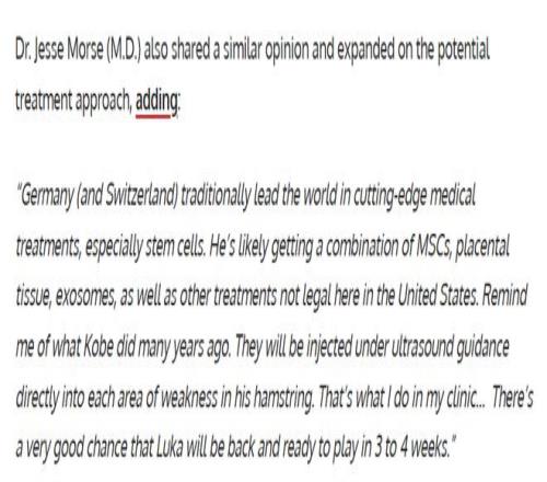 名醫(yī)杰西-莫斯也持有相似觀點,并進一步解讀了可能采用的治療方案:“德國(以及瑞士)在尖端醫(yī)療領(lǐng)域,尤其是干細(xì)胞治療方面,一直處于世界領(lǐng)先水平。他很可能會接受間充質(zhì)干細(xì)胞、胎盤組織、外泌體等聯(lián)合治療,其中一些療法在美國尚未獲批。這讓我想起多年前科比做過的治療。這些藥劑會在超聲引導(dǎo)下,直接注射到腿筋每一處受損薄弱的位置——這也是我在診所里采用的方案……東契奇非常有希望在3到4周內(nèi)康復(fù)并復(fù)出。”