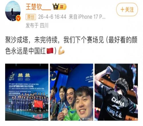 賽后王楚欽更新社媒,曬出國乒合影以及領(lǐng)獎(jiǎng)臺(tái)上和松島輝空、雨果、林昀儒的自拍合影,并配文寫道:“聚沙成塔,未完待續(xù),我們下個(gè)賽場(chǎng)見(最好看的顏色永遠(yuǎn)是中國紅