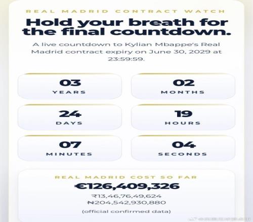 皇馬球迷專門做了一個網站,實時倒計時姆巴佩與皇馬的合同到期時間(2029年6月30日23:59:59)以及花費成本