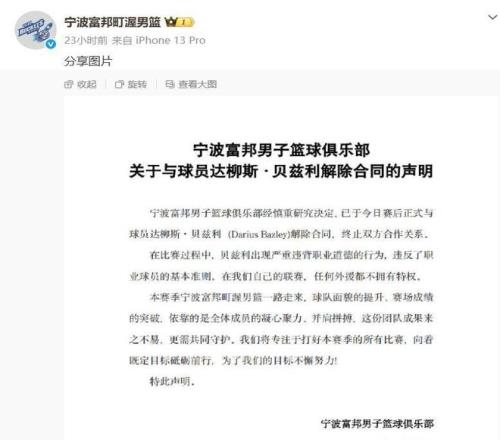 昨天晚上的比賽,寧波隊在主場以97-119不敵上海隊,送給上海隊17連勝。這場比賽剛開始55秒寧波隊就因為比賽失誤等問題發生內訌,外援貝茲利先是推搡隊友,隨后又和主教練發生口頭沖突,甚至出口辱罵寧波隊的管理層和老板。球隊方面也是當機立斷,在當天晚上就宣布和貝茲利解除合同??偨浝韯⒓页杀硎?,不管是國內球員還是外援都不能破壞我們的團結,否則立馬滾蛋。