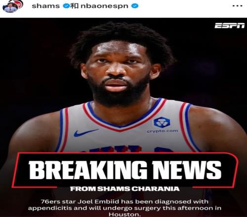 北京時(shí)間4月10日,費(fèi)城76人隊(duì)正在休斯頓備戰(zhàn)火箭隊(duì)。火箭隊(duì)正處于7連勝中,士氣正盛,他們需要更多勝利來(lái)穩(wěn)固西部第3的排名;76人隊(duì)正處于2連敗中,暫居?xùn)|部第8位,落后東部第6位的猛龍隊(duì)(44勝35負(fù))1個(gè)勝場(chǎng),落后東部第7的魔術(shù)隊(duì)(44勝36負(fù))0.5個(gè)勝場(chǎng),他們同樣渴望贏球以逃出附加賽區(qū)。大戰(zhàn)之前,76人隊(duì)卻傳來(lái)噩耗。據(jù)NBA名記Shams報(bào)道,76人隊(duì)中鋒大帝恩比德被診斷出患有闌尾炎,將于當(dāng)?shù)貢r(shí)間今天下午在休斯頓接受手術(shù)治療。