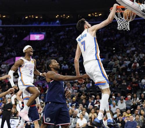 NBA常規賽繼續進行,俄克拉荷馬城雷霆隊(64勝16負)鎖定西部常規賽冠軍。霍姆格倫得到30分、14個籃板和5次助攻,亞歷山大得到20分和11次助攻,他們帶領球隊上半場確立大比分優勢后頂住對手反攻,雷霆隊在客場以128-110戰勝洛杉磯快船隊(41勝38負)。雷霆隊拿到7連勝,快船隊結束2連勝。這是雷霆連續第三個賽季獲得西部常規賽冠軍,也是連續兩個賽季戰績聯盟第一,馬刺確定西部第二。