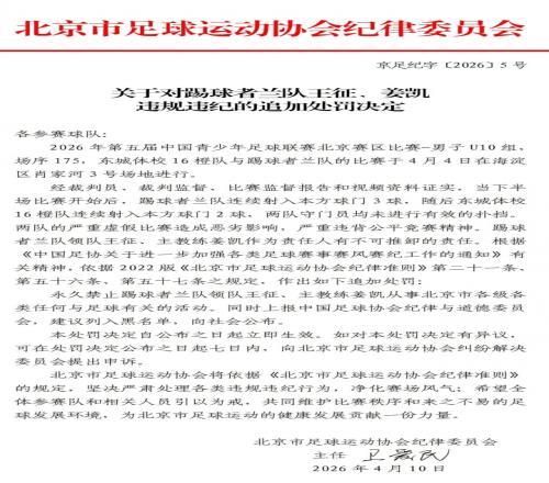 今天,北京市足協紀律委員會發布對中青賽U10組嚴重假球案的追加處罰通報,涉事兩隊的主教練、領隊從原有的禁賽一年,追罰提升至永久禁足!