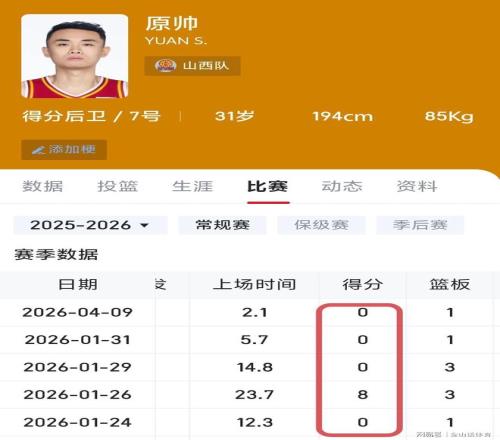 說一說山西隊頂薪球員原帥,本場比賽,厚帥繼續著他的“穩定”發揮,全場三分球2投0中,數據為0分1板0助0斷1犯規。由于狀態糟糕,只打了2分多鐘,就被換下坐在板凳上……