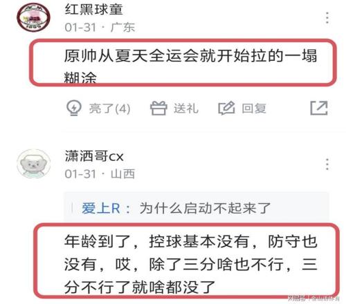 作為CBA曾經的“三分王”和“神投手”,拿600萬頂薪的原帥,狀態如此糟糕,也引來網友們吐槽“就是場場0分也不影響開賓利”;“原帥從夏天全運會就開始拉的一塌糊涂”;“年齡到了,控球基本沒有,防守也沒有,哎,除了三分啥也不行,三分不行了就啥都沒了”;“山西給他600萬頂薪,是打水漂了”……