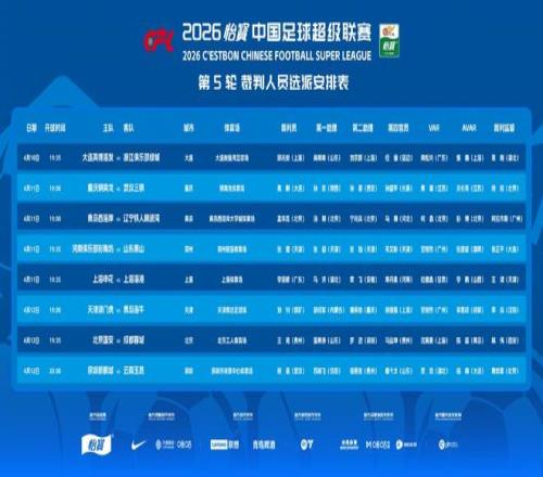 4月10日至12日,2026賽季中超聯(lián)賽展開第5輪角逐。賽前,中國足協(xié)發(fā)布了本輪裁判人員選派安排表。本輪8名主裁判中,有6人迎來中超首秀或賽季首秀,只有2位是熟面孔。