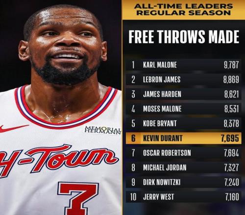 值得一提的是,杜蘭特上半場4罰全中,生涯總罰球命中數(shù)來到7695次,超越奧斯卡·羅伯特森升至歷史第六位。