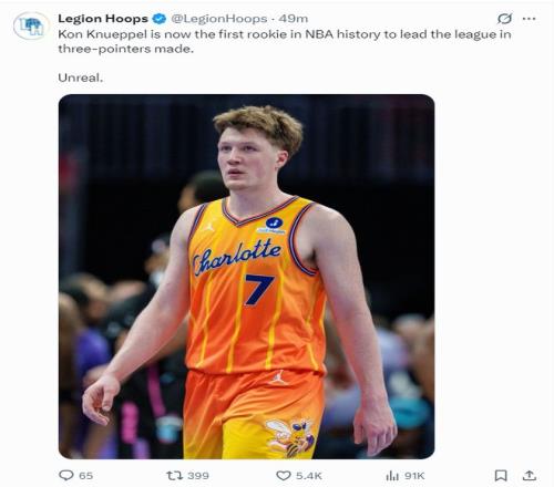 最終克努佩爾以單賽季273個三分球成為本賽季的三分王,他也成為NBA歷史首位新秀賽季就拿到三分王的球員,本賽季他場均18.5分5.3籃板3.4助攻,三分命中率高達42.5%,他是最佳新秀的大熱門。
