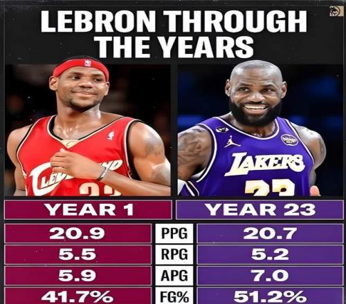 今日美媒公布了一組關于勒布朗·詹姆斯的數據對比:18歲的詹姆斯vs41歲的詹姆斯。