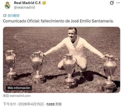 4月15日,皇家馬德里俱樂部在官方宣布,“本俱樂部和世界足壇最偉大的傳奇人物之一”何塞-埃米利奧-桑塔瑪利亞不幸去世,享年96歲。